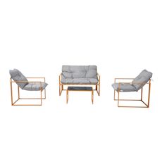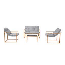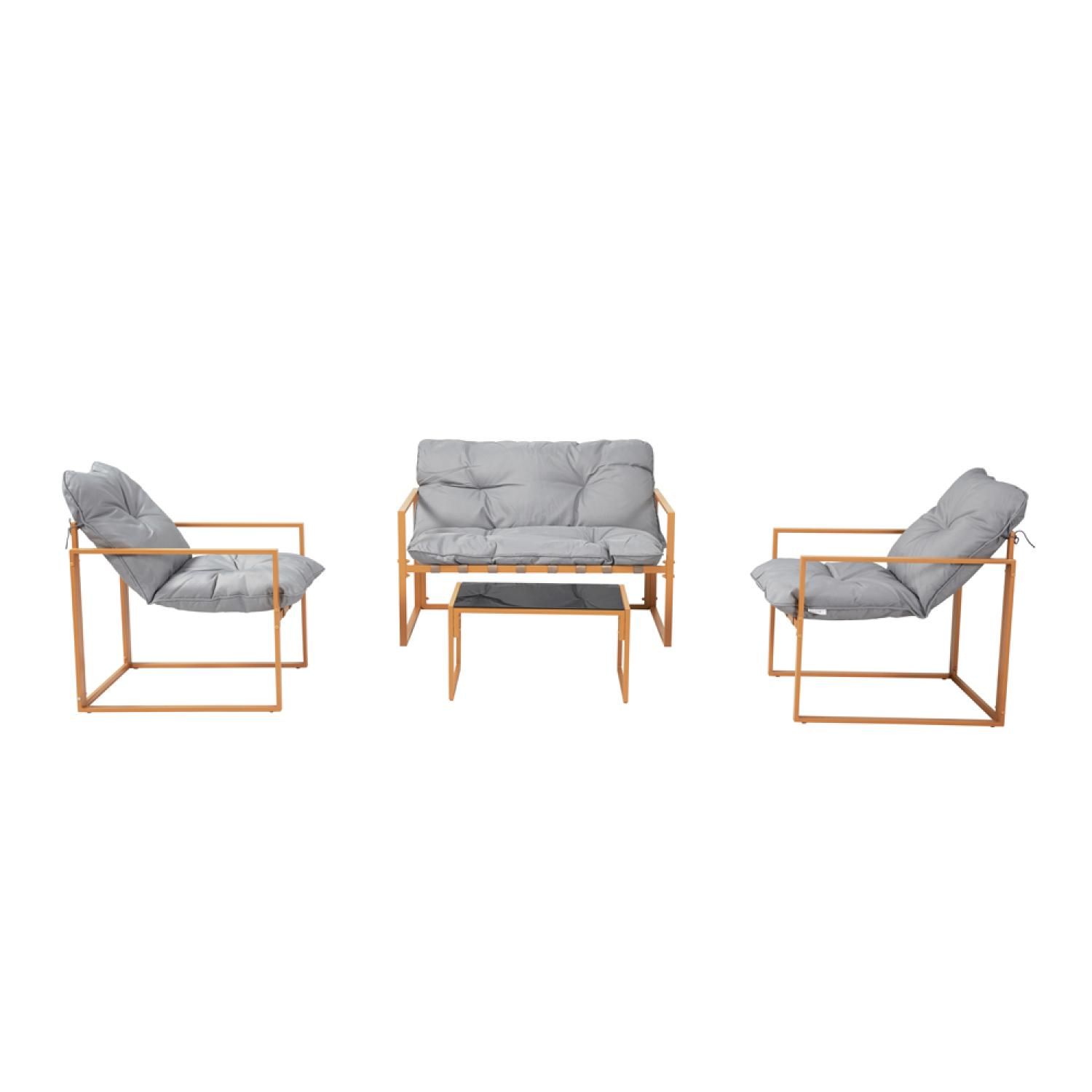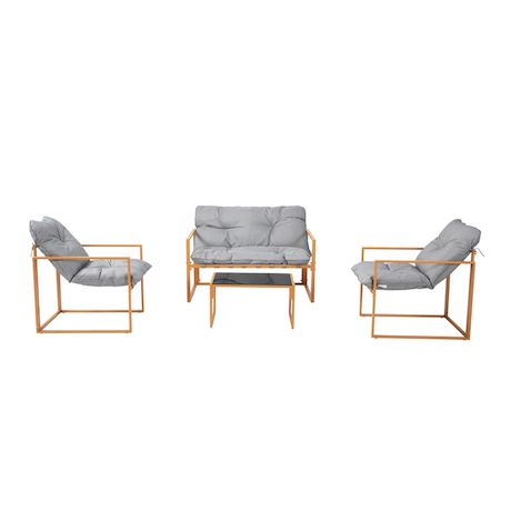 Caractéristiques techniques Couleur structure : BrunCouleur coussins : GrisNombre de places : 4Matériaux de la structure : Acier traité anti-corrosionFinition de la structure : PoudréeMatériaux des coussins : Polyester doublé polypropylèneDensité des coussins : 1000 g et 2000 gNombre de coussins : 3