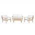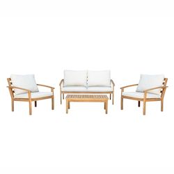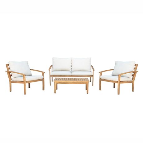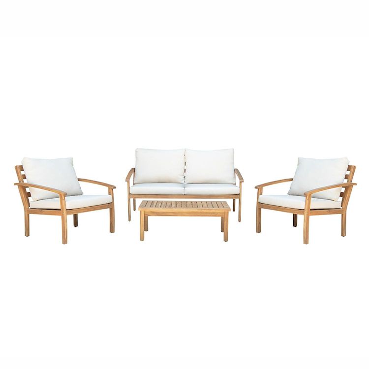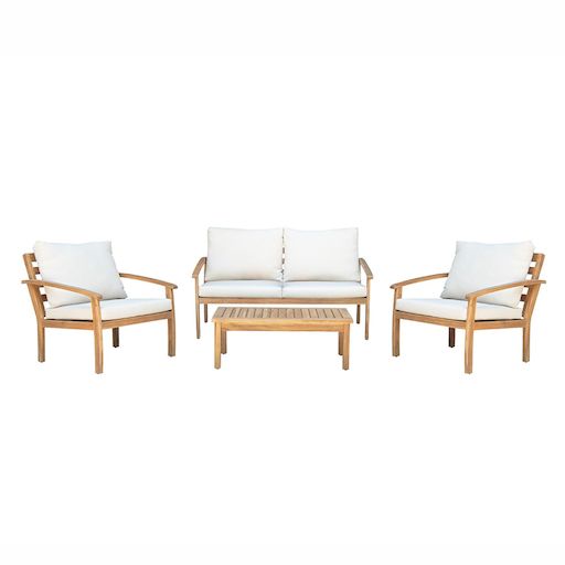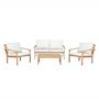 Caractéristiques techniques Composition : 1 canapé, 2 fauteuils, 1 table basseStructure : Bois d'acacia finition effet teckMatière des coussins : PolyesterDensité des coussins : 230g/m3Table rectangulaireCouleur des coussins : BeigeNombre de coussins : 8Epaisseur des coussins : 7 cmCoussins déhoussa