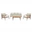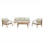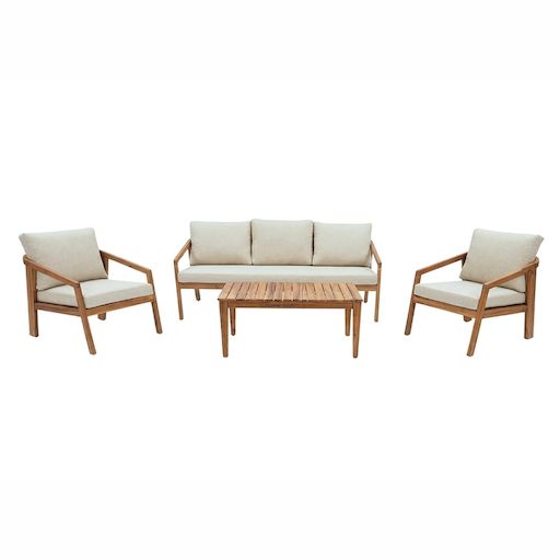 Caractéristiques techniques Composition : 1 canapé, 2 fauteuils, 1 table basseStructure : Bois d'acacia finition effet teckMatière des coussins : PolyesterDensité des coussins : 230g/m3Table rectangulaireCouleur des coussins : BeigeNombre de coussins : 8Epaisseur des coussins : 9 cmCoussins déhoussa