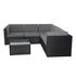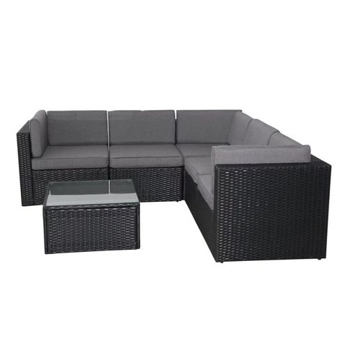 Caractéristiques techniques Nombre de places : 5Ensemble complet de jardin composé de : un canapé d'angle 5 places et une table basseCouleur : NoirCouleur des coussins : GrisType de revêtement : Résine tresséeStructure et piètement : AcierGarnissage : Mousse 22 kg / m3Tissu : Polyester 180 gPlateau