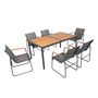 Caractéristiques techniques Couleur structure : Gris anthracite et boisCouleur toile : GrisNombre de places : 6Nombre de chaises inclues : 6Matériaux de la structure : AcierFinition de la structure : PoudréeMatériaux toile : Toile de polyester gainée de pvcChaises empilables : NonTable extensible :