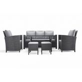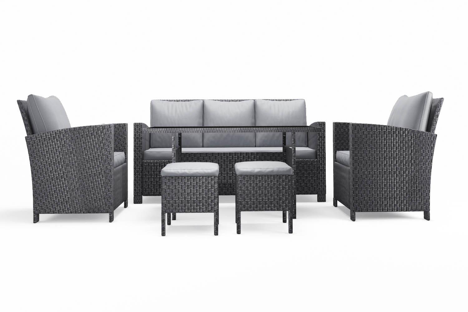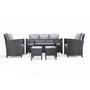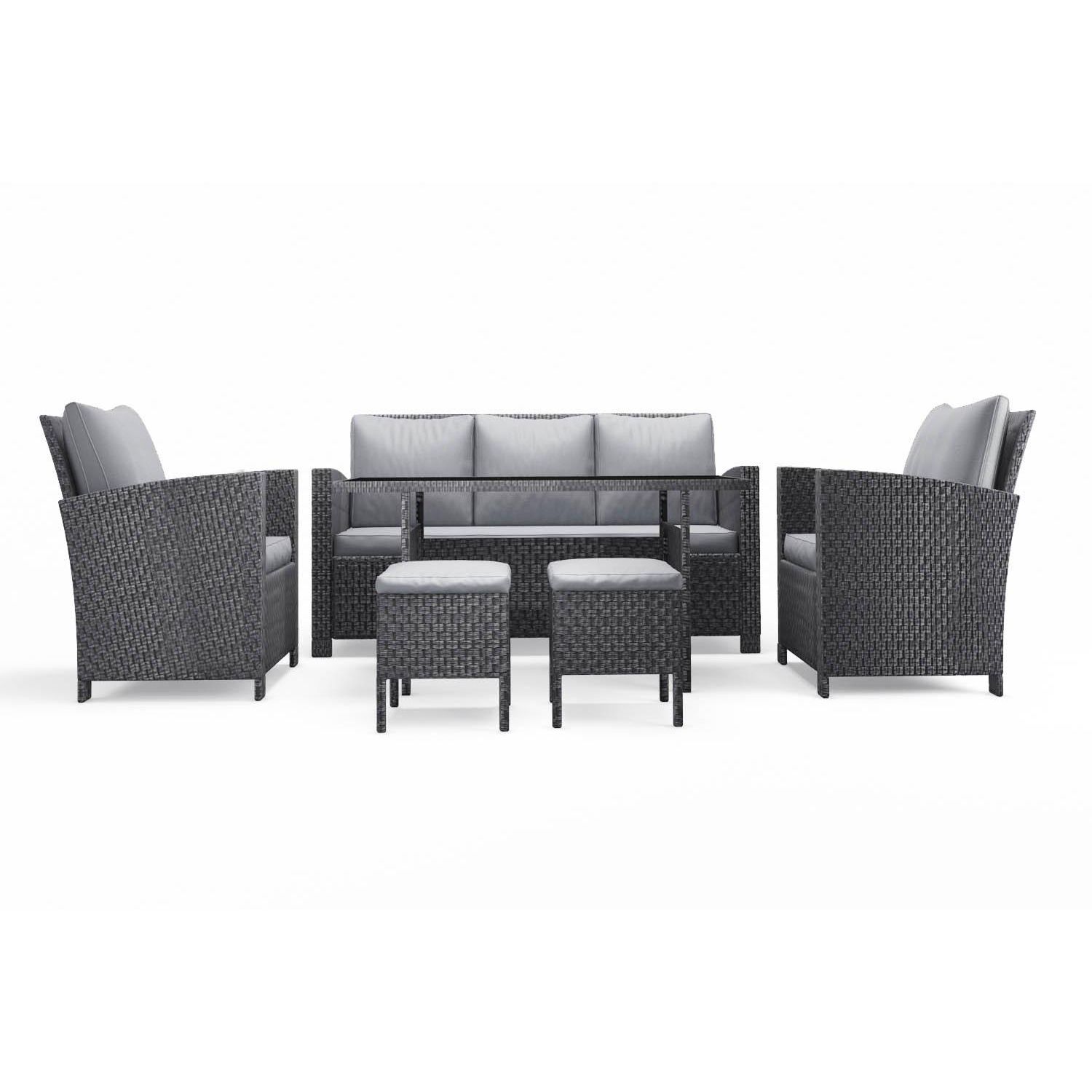 Caractéristiques techniques :Nombre de pièces : 6Detail des pièces : 1 table, 1 canape, 2 fauteuils, 2 poufsType de salon de jardin : RepasCouleur : GrisForme de la table : RectangleMatière structure : AcierMatière table : Resine tresseeVerre sur la table : OuiType de verre : Verre trempe noirAvec