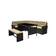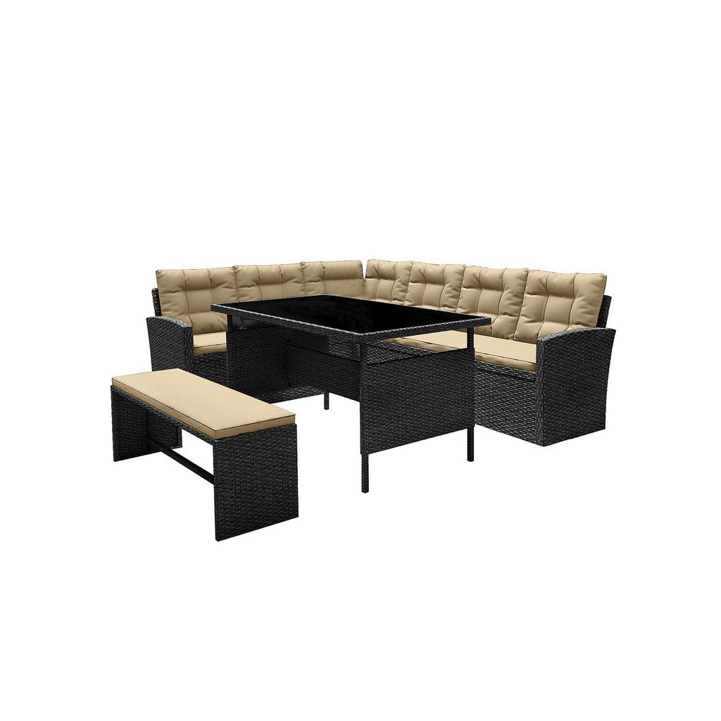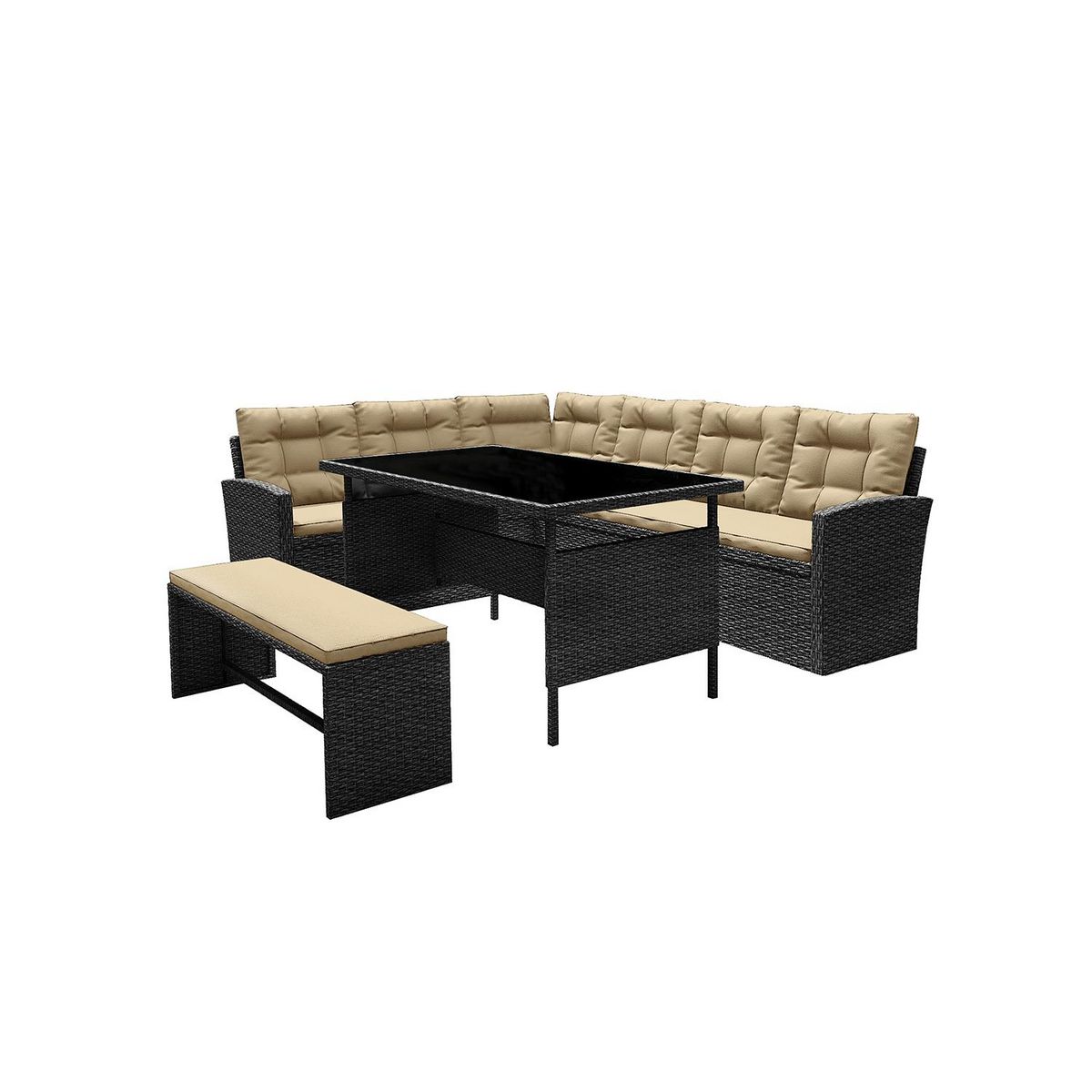Caractéristiques techniques Nombre de places : 8Modules : 1 canapé d'angle, 1 banc et 1 tableType de salon de jardin : RepasCouleur principale : Gris foncéCouleur coussins : EcruForme de la table : RectangleMatière structure : Résine tressée et acierVerre sur la table : Verre trempé 5 mm couleur gri