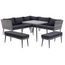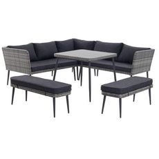 Caractéristiques techniques :Nombre de places : 9Nombre de modules : 6Detail des pièces : 1 table, 3 fauteuils, 1 poufType de salon de jardin : DetenteCouleur : GrisForme de la table : CarreMatière : Resine tresseeVerre sur la table : OuiType de verre : Verre trempeAvec coussin : OuiNombre de couss