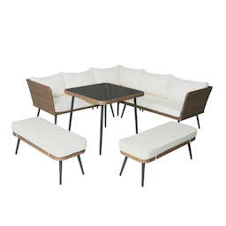 Caractéristiques techniques Nombre de places : 9Ensemble complet de jardin composé de 6 pièces : 2 canapés deux places, 1 élément de fauteuil d'angle, 2 bancs et 1 tableCouleur : MarronCouleur des coussins : BeigeMatière : Résine tresséeMatière coussins : Polyester 200 gGarnissage coussins : coton 1