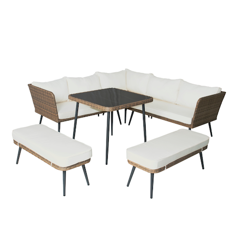 - Ensemble complet de jardin composé de 6 pièces : 2 canapés deux places, 1 élément de fauteuil d'angle, 2 bancs et 1 table