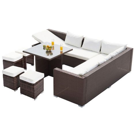 Caractéristiques techniques :Salon complet en resine tressee plate 4 filsNombre de places : 10 placesForme de la table : carreStructure : acier et resine tresseeMatière des peids : acierNombre de poufs : 4Couleur de la resine : marronCoussins fournis : OuiNombre de coussins : 12Couleur des coussins