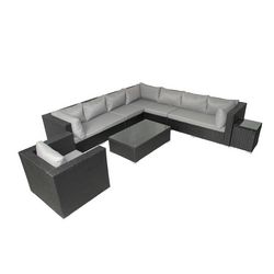 Caractéristiques techniques Nombre de places : 8 Couleur : Noir Couleur des coussins : Gris Matériaux structure : Aluminium Matériaux : Résine tressée Matériaux coussins : 100% polyester Matériaux table : Verre trempé transparent Coussins déhoussables : Oui Garnissage coussins : Coton 1800 g Poids
