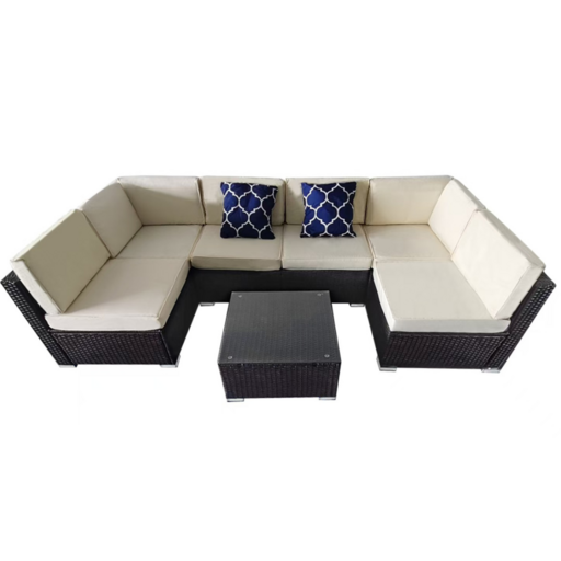 Caractéristiques techniques Nombre de places : 6Ensemble complet de jardin composé de 7 pièces : 4 fauteuils, 2 éléments de fauteuils d'angle, 1 table basse.Couleur : MarronCouleur secondaire : BeigeCouleur des coussins : BeigeNombre de coussins décoratifs inclus : 2Salon de jardin modulable : en U,