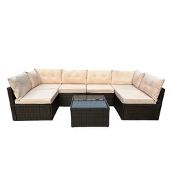 Caractéristiques techniques Nombre de places : 6Ensemble complet de jardin composé de 4 pièces : 1 sofa, 2 éléments de fauteuils d'angle, 1 table basse. Salon de jardin modulable : en U, face à face, en angleCouleur : MarronCouleur des coussins : BeigeCoussins déhoussables : OuiType de revêtement st