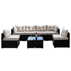 Transformez votre espace extérieur avec ce salon de jardin modulable 6 places, alliant design moderne et praticité. En résine tressée noire avec coussins beige, il offre un confort optimal et une modularité totale (U, face à face, angle).Complet avec sofa, fauteuils d'angle et table basse en verre t
