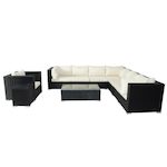 Caractéristiques techniques Nombre de places : 8Couleur : NoirCouleur des coussins : BlancMatériaux : Résine tresséeMatériaux coussins : 100% polyesterCoussins déhoussables : OuiMatériaux structure : AluminiumMatériaux table : Verre trempé transparentGarnissage coussins : coton 1800 gPoids maximum s