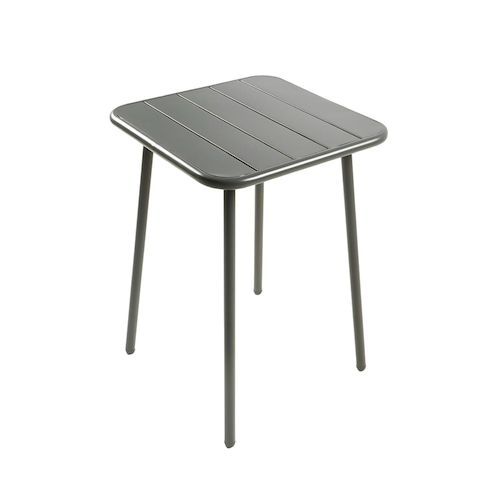 Caractéristiques techniques Nombre de places : 2Type de table de jardin : RepasCouleur principale : Gris foncéForme de la table : CarréMatière : Acier thermolaquéRésistance aux rayons du soleil et à la corrosionNombre de pieds : 4Déperlant : Oui, grâce aux lattes ajourées de la tableTable vendue san