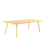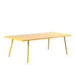 Caractéristiques techniques Nombre de places : 10 à 12 placesType de table de jardin : RepasCouleur principale : JauneForme de la table : RectangleMatière : Acier thermolaquéRésistance aux rayons du soleil et à la corrosionNombre de pieds : 4Déperlant : Oui, grâce aux lattes ajourées de la tableTabl