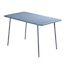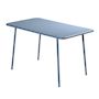 Caractéristiques techniques Nombre de places : 4 à 6 placesType de table de jardin : RepasCouleur principale : BleuForme de la table : RectangleMatière : Acier thermolaquéRésistance aux rayons du soleil et à la corrosionNombre de pieds : 4Déperlant : Oui, grâce aux lattes ajourées de la tableTable v