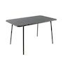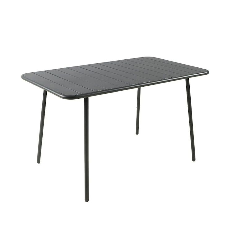 Caractéristiques techniques Nombre de places : 4 à 6 placesType de table de jardin : RepasCouleur principale : Gris foncéForme de la table : RectangleMatière : Acier thermolaquéRésistance aux rayons du soleil et à la corrosionNombre de pieds : 4Déperlant : Oui, grâce aux lattes ajourées de la tableT