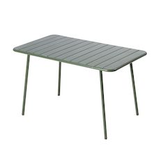 Caractéristiques techniques Nombre de places : 4 à 6 placesType de table de jardin : RepasCouleur principale : VertForme de la table : RectangleMatière : Acier thermolaquéRésistance aux rayons du soleil et à la corrosionNombre de pieds : 4Déperlant : Oui, grâce aux lattes ajourées de la tableTable v