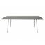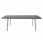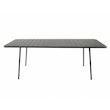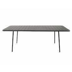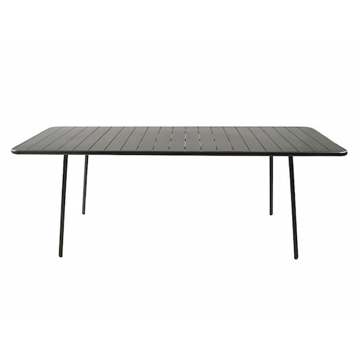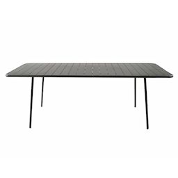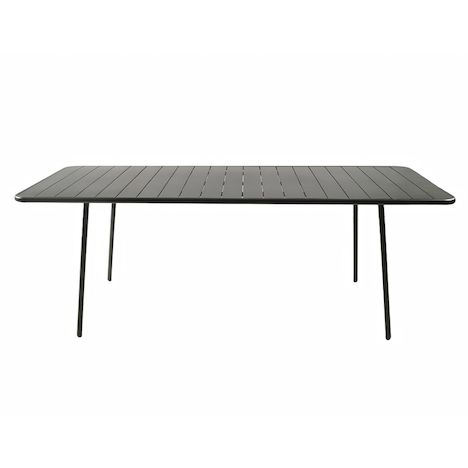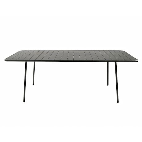 Caractéristiques techniques Nombre de places : 8 à 10 placesType de table de jardin : RepasCouleur principale : Gris foncéForme de la table : RectangleMatière : Acier thermolaqué Résistance aux rayons du soleil et à la corrosionNombre de pieds : 4Déperlant : Oui, grâce aux lattes ajourées de la tabl