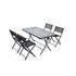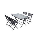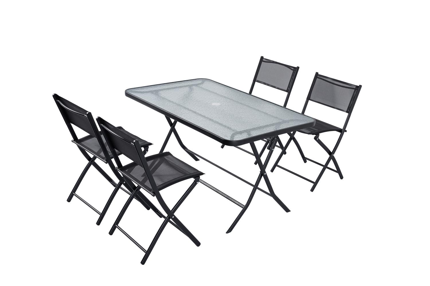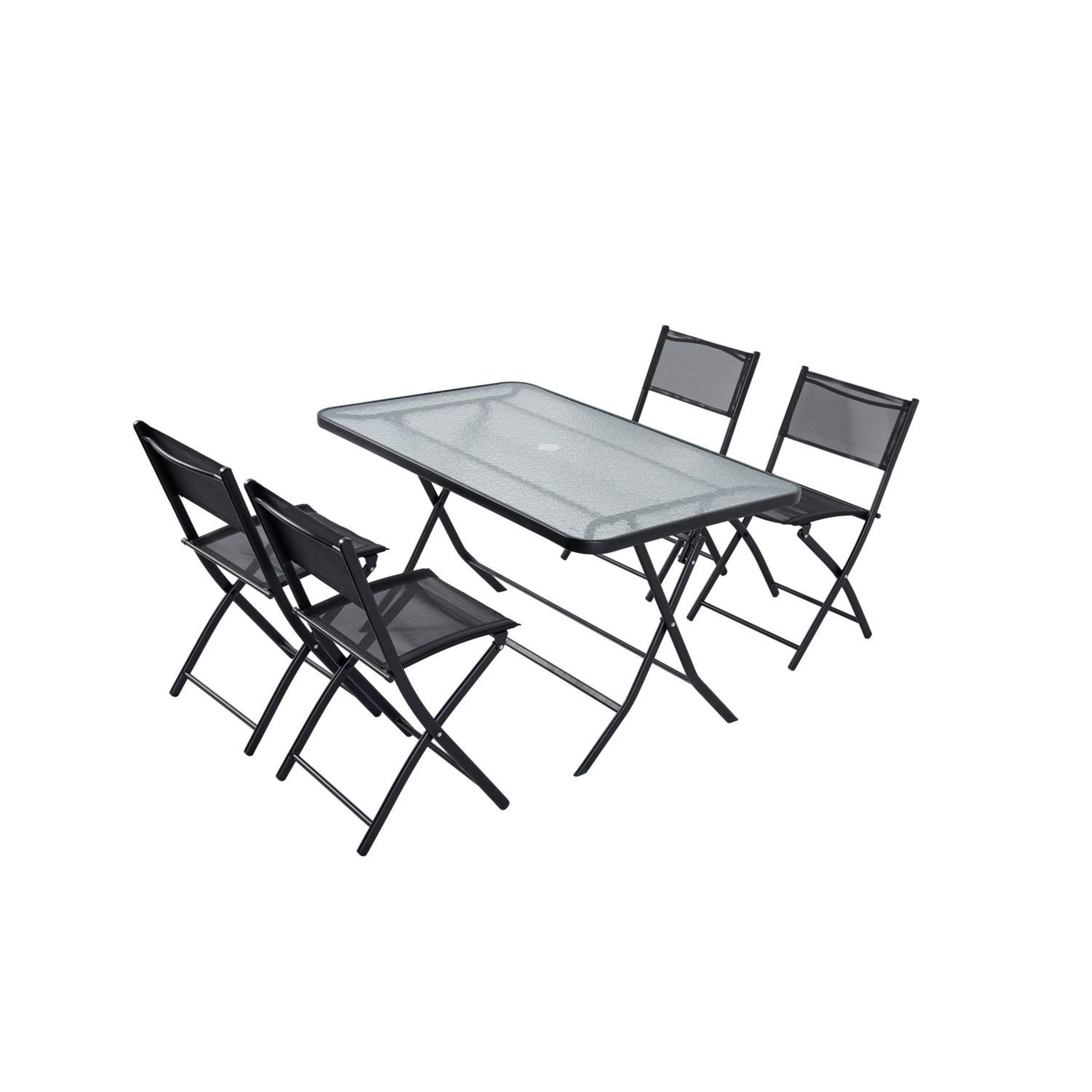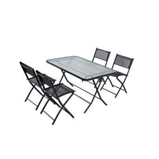 Profitez d'un bon repas avec vos proches autour de ce lot compose d'une table avec 4 chaises. Avec ses chaises et sa table pliables, cet ensemble pratique et non encombrant vous offre un vrai gain de place. L'ensemble est en acier recouvert de peinture epoxy avec un plateau en verre trempe, ce qui garantit un salon robuste et leger que vous pourrez ranger et deplacer très facilement. Restez confortablement installe avec une assise en toile PVC et une table assez grande pour manger à 4 personnes. Alors n'hesitez plus et passez des moments conviviaux avec vos proches autour de l'ensemble de jardin Mahon !
