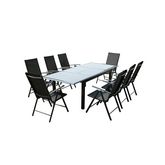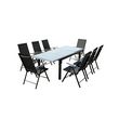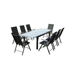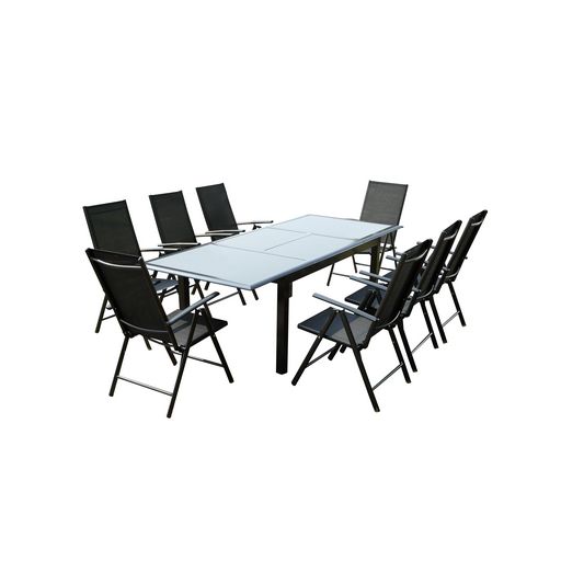 Ravenne est un magnifique salon de jardin 8 places compose d'une table en aluminium recouverte d'une belle plaque de verre noire d'une epaisseur de 5 mm. Elle mesure 75 cm de haut pour une longueur de 1,60 m à 2,40 cm en utilisant la rallonge d'un mètre. Ses huit larges chaises en aluminium et en toile en polyester gaine de PVC ultra resistant sont inclinables et pliables. La dimension de l'assise est de 56x65.5 cm, la hauteur va de 84 à 107 cm selon l'inclinaison que vous choisirez.