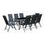 Rimini est un salon de jardin haut de gamme compose d'une table de forme rectangulaire en aluminium recouverte d'une fine plaque de verre brillant. Ses 8 fauteuils inclinables sur 7 crans sont en aluminium, l'assise et le dossier sont en polyester gaine de PVC ultra resistant.