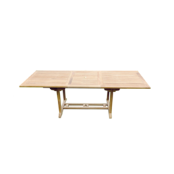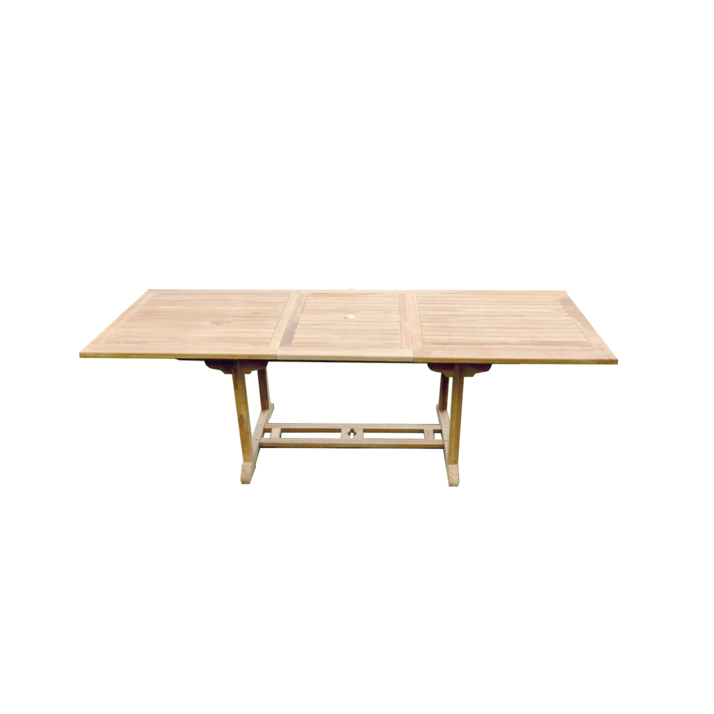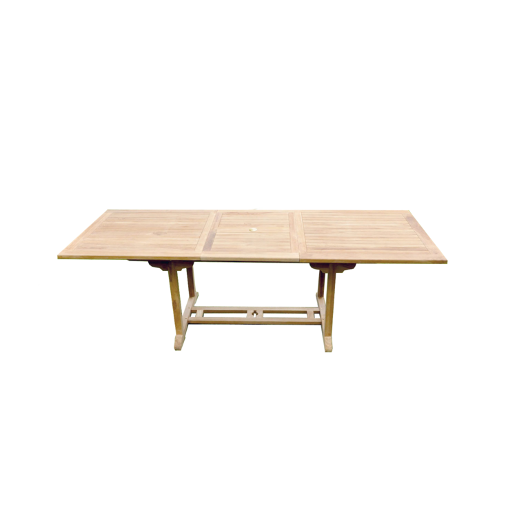 Pouvant accueillir jusqu'à 10 personnes, la table de jardin Kajang en teck brut est munie d'une rallonge papillon.