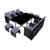 Caractéristiques techniques :Nombre de places : 10 (6 fauteuil & 4 poufs)Type de salon de jardin : RepasCouleur principale : NoirCouleur secondaire : GrisForme de la table : RectangleMatière : Resine tressee (PE)Matière plateau de table : Verre (encastre dans la table)Structure : MetalDossiers raba