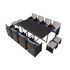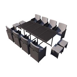Caractéristiques techniques :Nombre de places : 12 (8 fauteuils & 4 poufs)Type de salon de jardin : RepasCouleur principale : NoirCouleur secondaire : GrisForme de la table : RcetangleMatière : Resine tressee (PE)Matière plateau de table : Verre (encastre dans la table)Structure : MetalAvec coussin