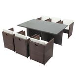 Superbe Salon de Jardin luxe 6 personnes en resine tressee, encastrable. Table carree bi-matière (resine tressee et verre renforce 5 mm)+ 6 fauteuils habilles (coussins blancs) empilables et encastrables sous la table pour un gain de place optimal.
