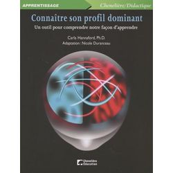 La Dre Carla Hannaford trace la fascinante frontière de la connaissance sur la connexion entre l'esprit et le corps, et son impact sur l'apprentissage et la réflexion à tous les âges de la vie. Son livre précédent, La Gymnastique des neurones, a été acclamé pour ses idées sur le rôle du corps dans l'apprentissage. Selon Joseph Chilton Pearce, il s'agit d'un ouvrage majeur d'une profonde importance pour notre compréhension du développement de l'enfant et de l'éducation. Dans Connaître son profil dominant : un outil pour comprendre notre façon d'apprendre, elle explore un terrain qui a longtemps intrigué les scientifiques et les éducateurs : les liaisons qui existent entre le côté de notre corps que nous favorisons pour voir, entendre, toucher et bouger, et la façon dont nous pensons, apprenons, travaillons, jouons et établissons des rapports avec nos pairs. Le profil dominant est un facteur clé dans la façon de penser et d'agir de l'être humain. Carla Hannaford explique clairement les méthodes qui vous permettront de découvrir votre profil. Elle nous révèle pourquoi et comment le fait de connaître ce profil peut vous aider, vos enfants et vous, à apprendre de la manière qui vous convient le mieux puis à atteindre des performances optimales.