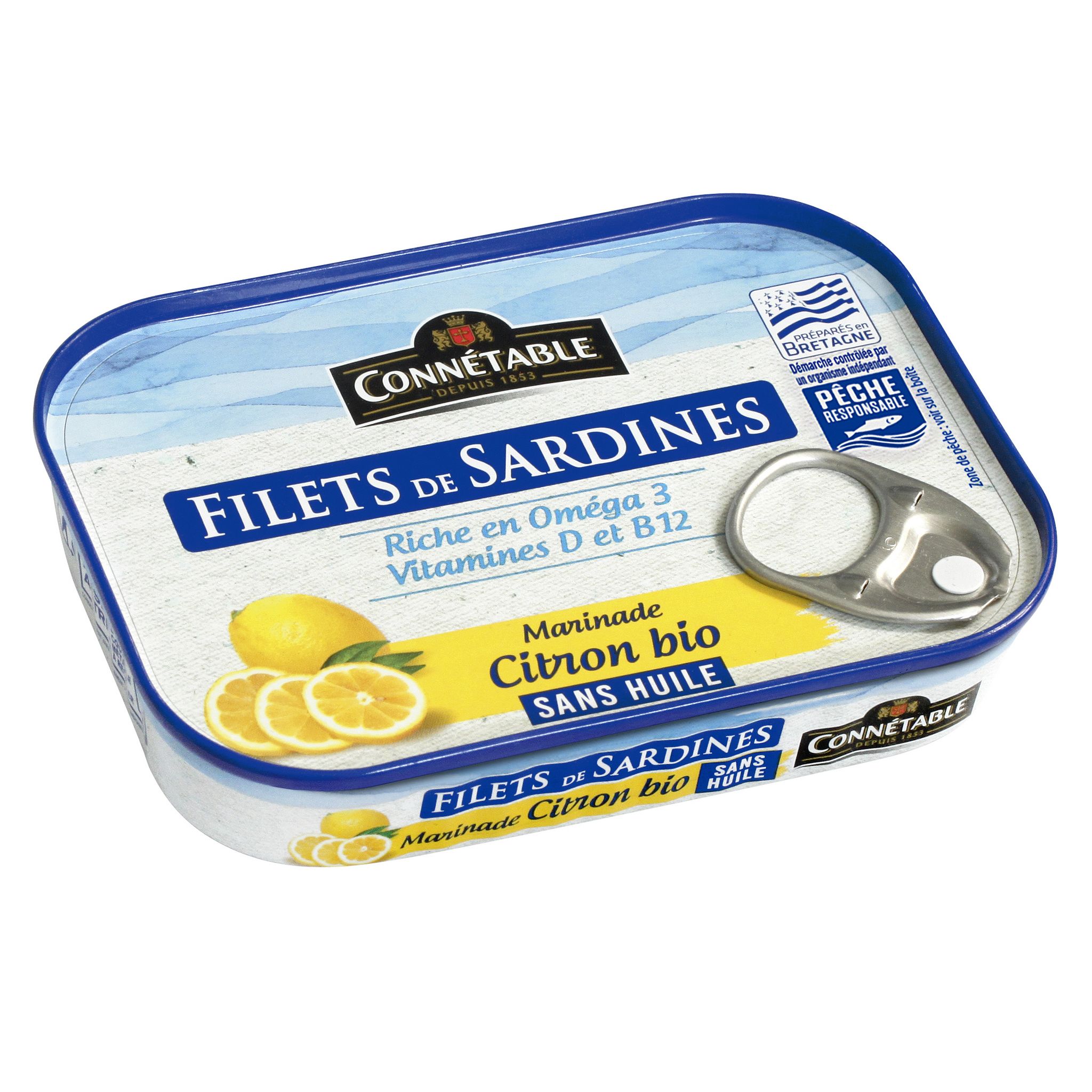 Issues d'une pêche durable, ces sardines riches en calcium, Oméga 3, vitamines D et B12 sont préparées à la main à Douarnenez en Bretagne. Cuisinées avec de bons ingrédients bio, elles allient parfaitement bienfaits et gourmandise. Filets de sardines marinade au citron Bio