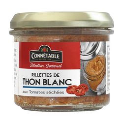 Ingrédients : THON blanc (germon) 50%, eau, huile de tournesol, tomates séchées 5%, concentré de tomates, oignons, sucre, sel, ail, épaississant : gomme guar, persil, basilic, thym.