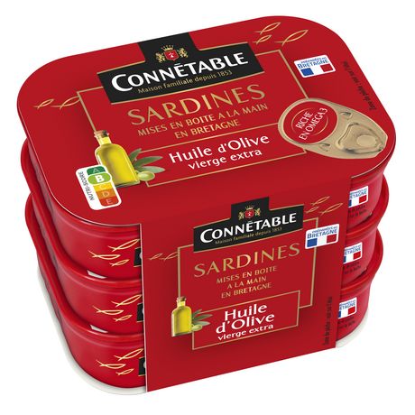 Produit phare de la marque Connétable, les sardines entières à l'huile d'olive et leur célèbre boîte rouge ravissent depuis bien longtemps les gourmands de tous âges. Ces sardines sont sélectionnées avec soin et mises en boîte à la main pour assurer une qualité optimale, avant d'être recouvertes d'une savoureuse huile d'olive vierge extra pour le plus grand plaisir des gourmets..