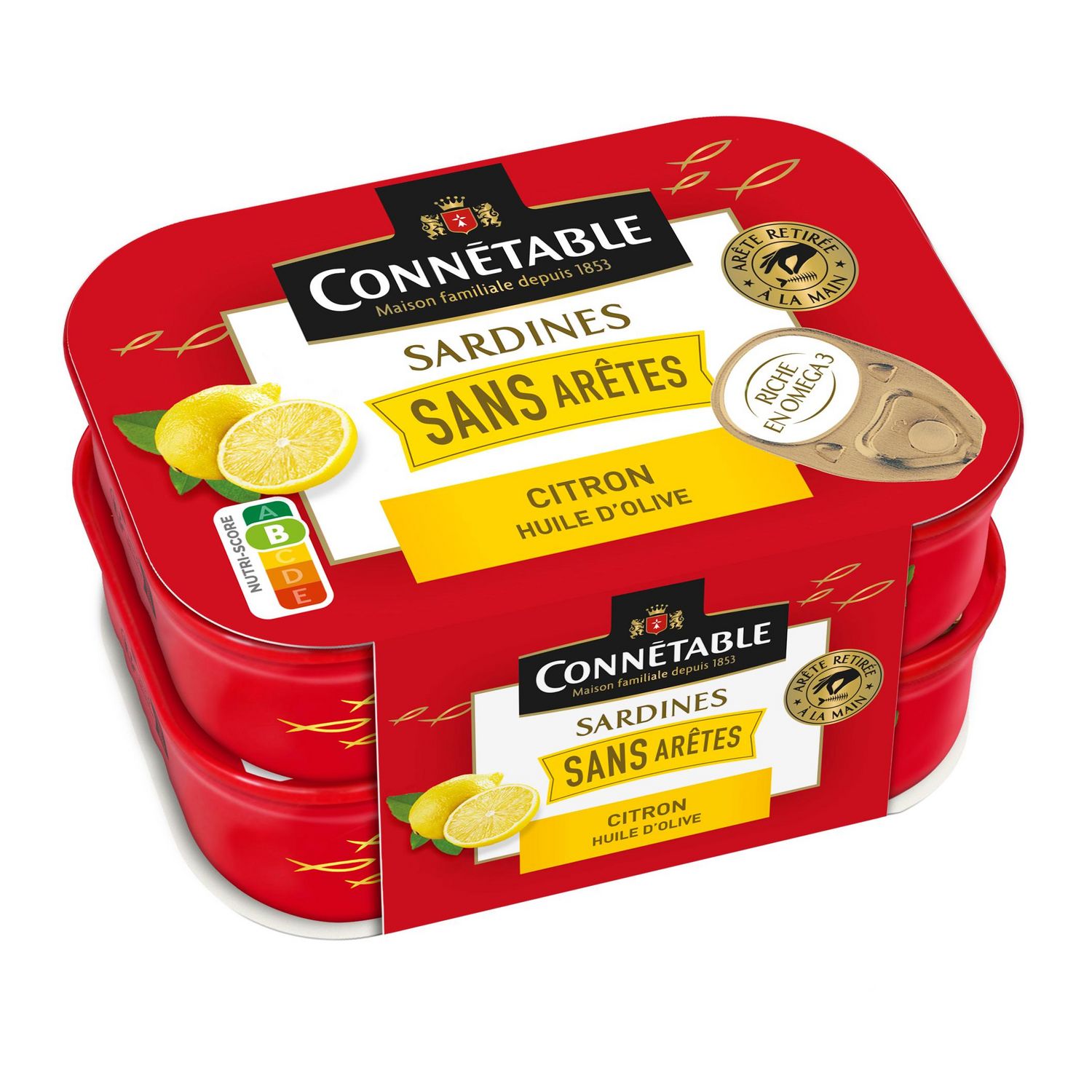 SARDINES (Sardina pilchardus), huile d'olive vierge extra 21%, rondelle de citron 3,0%, sel.