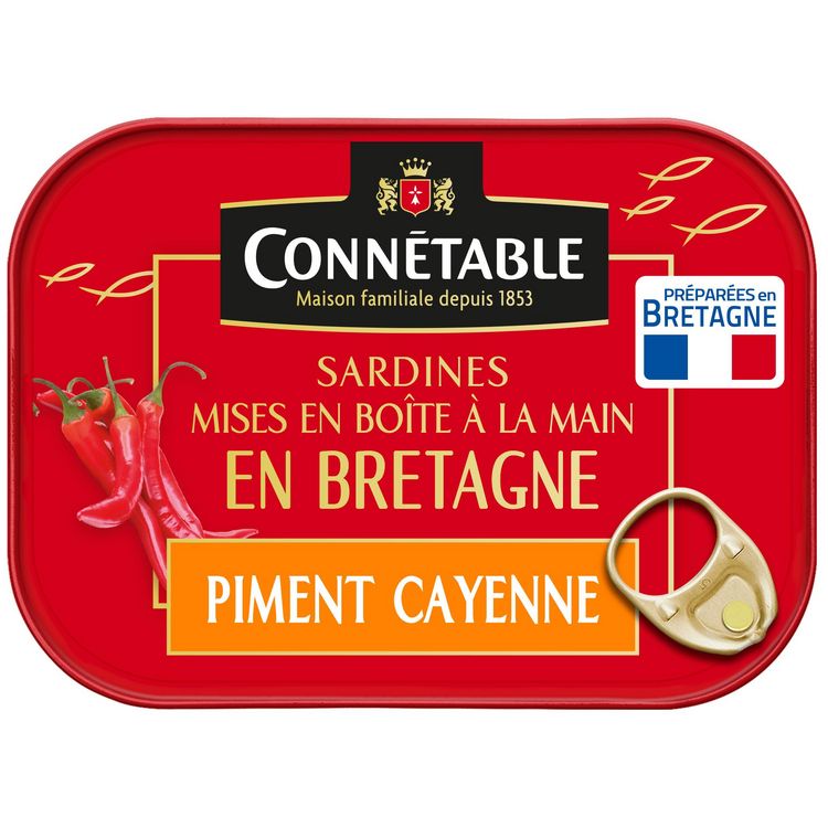 Ces sardines Mises en boite à la main en Bretagne Connétable sont accompagnées d'une préparation bien relevée au piment de Cayenne puis nappées d'huile pour le plus grand plaisir des gourmets. Idéales pour un repas sain et riche en saveurs.
