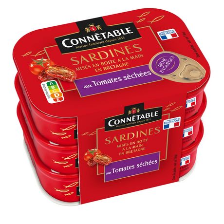 Ces sardines Mises en boite à la main en Bretagne Connétable sont accompagnées d'une préparation gourmande aux tomates séchées puis nappées d'huile pour le plus grand plaisir des gourmets. Idéales pour un repas sain et riche en saveurs.
