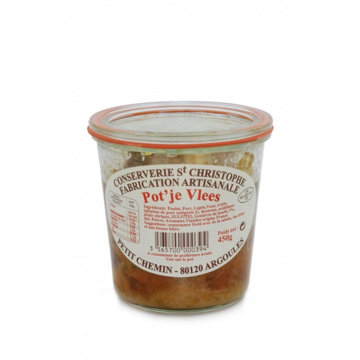Porc, Lapin, Poulet, Veau, gelée, (gélatine de porc catégorie G, dextrose, acidifiant : acide citrique, SULFITE), Genièvre de Houlle 2.5%, Sel, Poivre, Aromates.