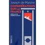 Dans les Considérations sur la France, Joseph de Maistre livre son regard implacable sur les événements de la Révolution française. Il en analyse les causes et s'interroge sur les sources du pouvoir royal et les conditions d'un rétablissement monarchique en France. Dans ce livre paru en 1797, il prévoit le retour du roi et la faillite de la Constitution de 1795. Dès sa sortie, cet essai lucide et prophétique suscita un vif intérêt. Il s'inscrivit parmi les altiques de la philosophie politique et ne cessa jusqu'à aujourd'hui d'exercer une profonde influence. Pour Joseph de Maistre, la contre-révolution ne sera point une révolution contraire, mais le contraire d'une révolution . Considérations sur la France n'a rien perdu de son actualité.