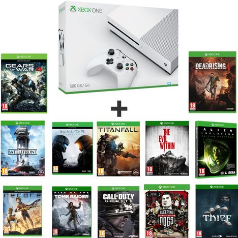Console Xbox One S 500 Go + TITANFALL + THE EVIL WITHIN + ALIEN ISOLATION - LIMITED EDITION + CALL OF DUTY GHOSTS + SLEEPING DOGS + THIEF + HALO 5 GUARDIANS + RISE OF THE TOMB RAIDER + STAR WARS BATTLEFRONT + RECORE + GEARS OF WAR 4 + DEAD RISING.