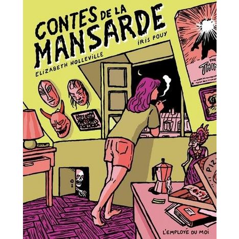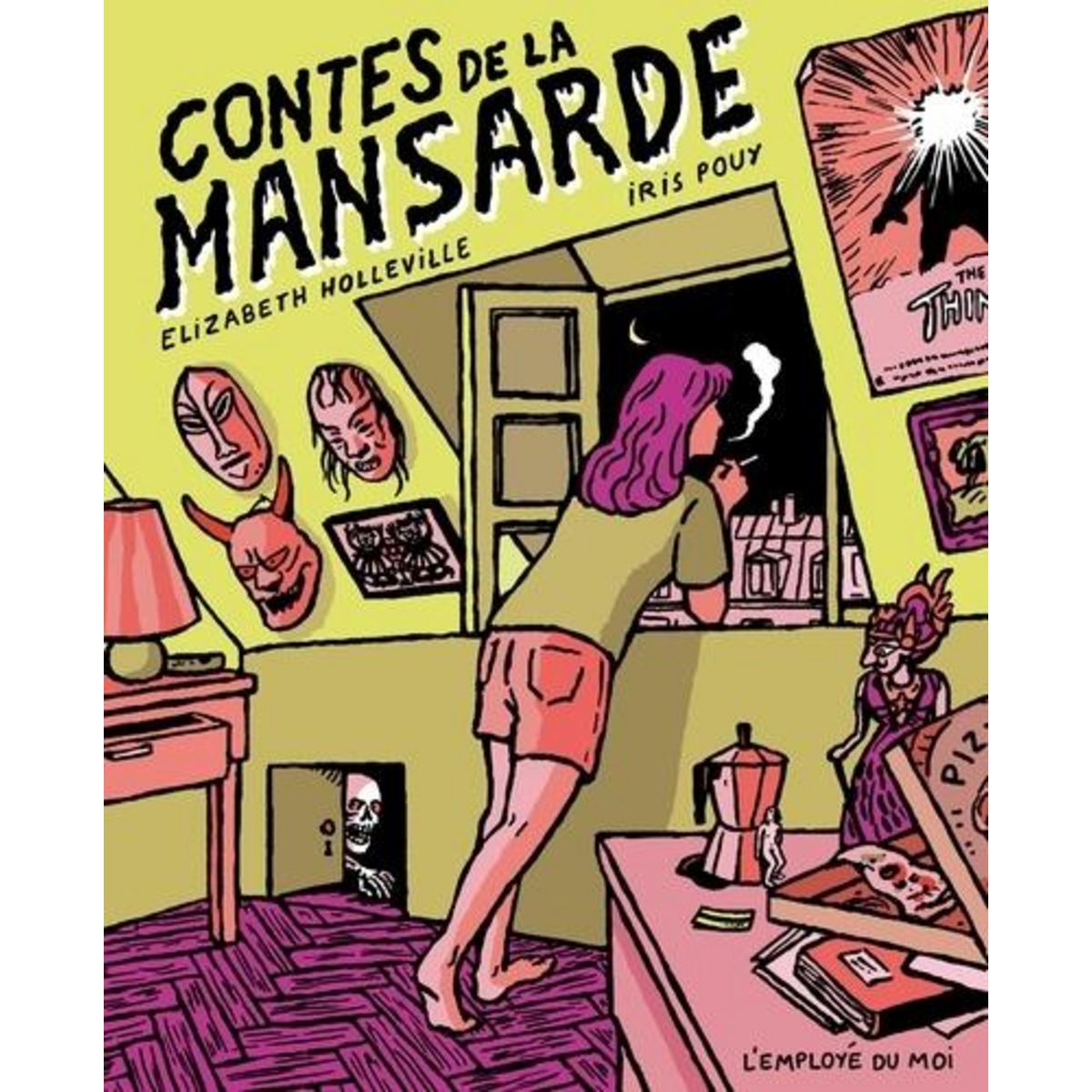 Bastien a besoin de savoir le jour exact de sa mort. Il fait appel aux services d'un étrange laboratoire qui affirme qu'il devrait décéder le surlendemain d'une asphyxie alimentaire. Depuis que sa copine a hérité de la collection d'arts premiers de sa grand-mère, rien n'est plus comme avant pour Miriam. Elle est prise d'irrépressibles démangeaisons et ce n'est là que le début de son calvaire Barbara est autrice de bande dessinée. Un soir, elle pénètre dans le petit placard dissimulé derrière son bureau pour y découvrir une pièce dérobée sous les combles. Cette exploration va bouleverser son quotidien. Chacun des trois chapitres des Contes de la Mansarde se déroule dans le même appartement, au septième et dernier étage d'un immeuble parisien, au cours de trois étés caniculaires. Dans ces histoires qui donnent la chair de poule, l'amour, souvent contrarié, tient toujours un rôle important. Et, si l'effroi apparaît par des manifestations du surnaturel, il se dissimule aussi dans les recoins de nos névroses modernes : dépression, solitude, obsession ou anxiété. Avec leurs récits macabres, Elizabeth Holleville et Iris Pouy évoquent les lectures de leur enfance, les contes de Perrault et de Marcel Aymé, les films de genres, autant que les bandes dessinées américaines de l'ère pré-comics code.