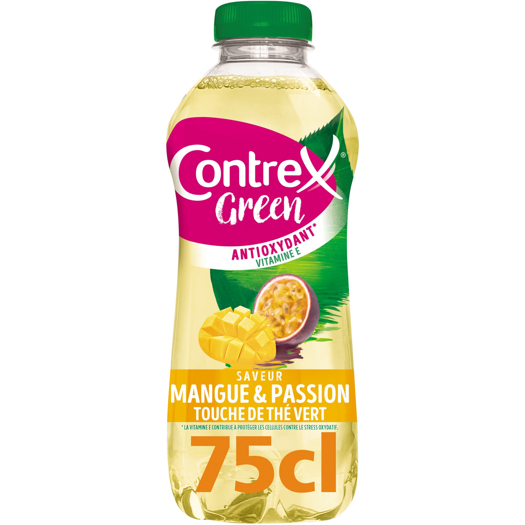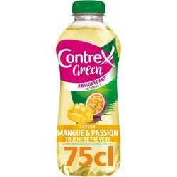 Boisson à l'eau minérale naturelle Contrex et à l'extrait de thé vert, enrichie en vitamines E. Saveur mangue et fruits de la passion.