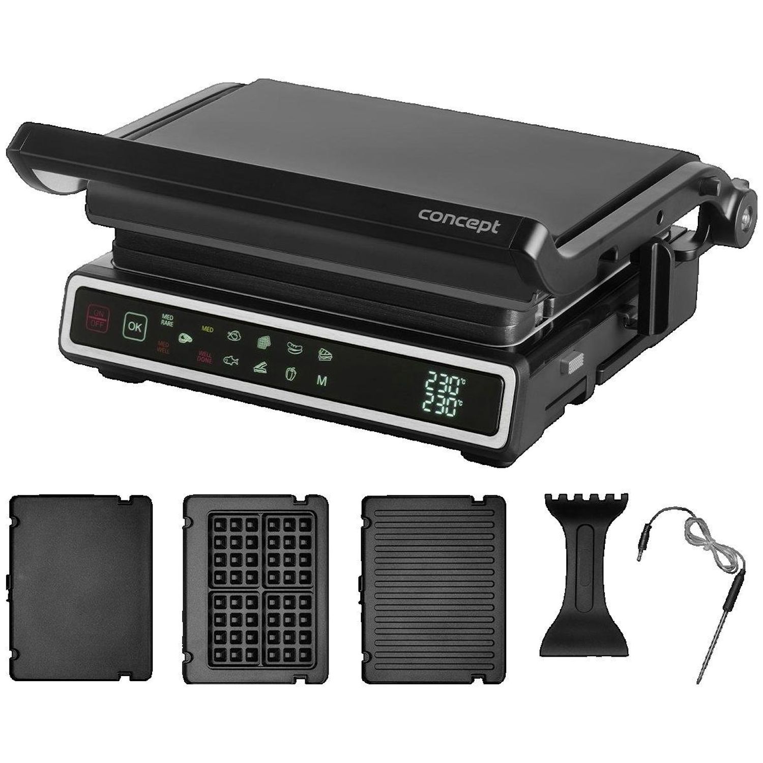 Découvrez le grill électrique Concept-solution GE3550, un appareil de cuisine moderne et compact idéal pour réaliser un barbecue toute l'année. Ce grill électrique permet une cuisson simultanée des deux côtés grâce à ses plaques antiadhésives. Il dispose d'une sonde de température intégrée pour un contrôle précis de la cuisson. Profitez des 11 programmes automatiques incluant un mode DIY pour cuire parfaitement viandes, légumes et autres aliments. Son châssis en acier inoxydable assure robustesse et facilité de nettoyage. Poids : 3 kg.