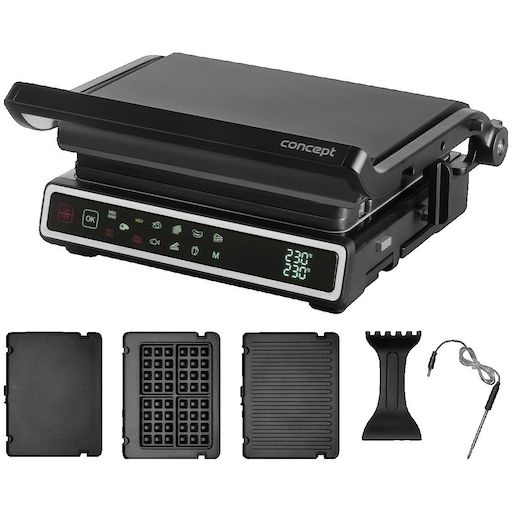 Découvrez le grill électrique Concept-solution GE3550, un appareil de cuisine moderne et compact idéal pour réaliser un barbecue toute l'année. Ce grill électrique permet une cuisson simultanée des deux côtés grâce à ses plaques antiadhésives. Il dispose d'une sonde de température intégrée pour un c