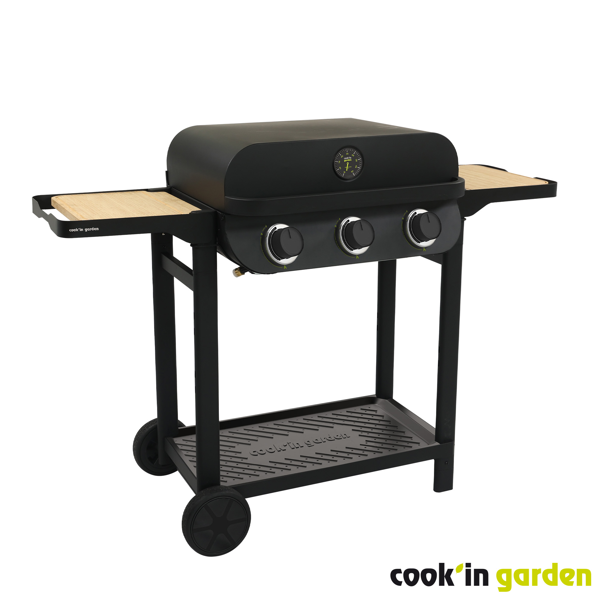 Barbecue gaz sur chariot FLAVO 60 Cook'in Garden - 3 Bruleurs droits en Inox - Puissance 8,4 kW -2/3 grilles & 1/3 plancha en fonte émaillée -Surface de cuisson 60 x 40 cm - Allumage Piezzo intégré - Boutons avec indicateurs de chaleur. Equipé d’un tiroir récupérateur de graisse, d’un capot double paroi avec thermomètreet de 3 tablettes amovibles, dont 2 avec des planches à découper en bambou -Montage facile