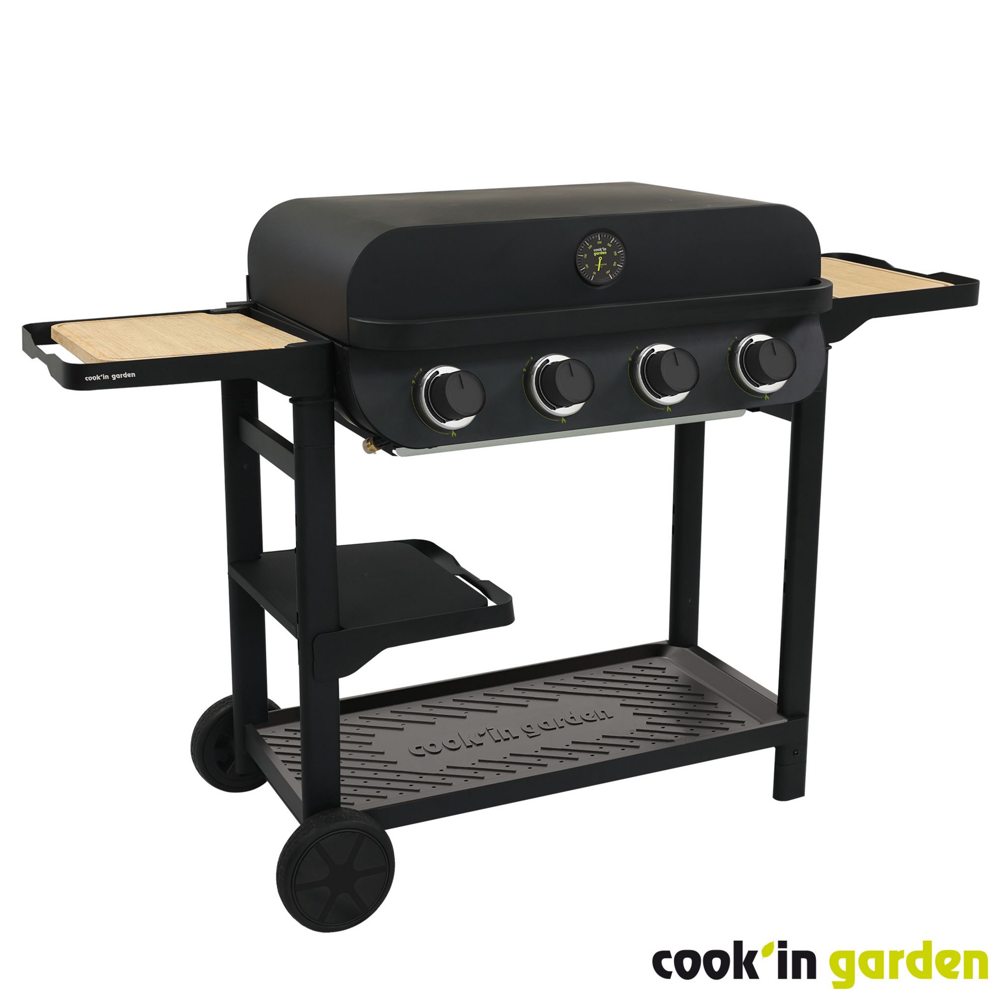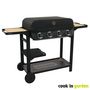 Barbecue gaz sur chariot FLAVO 60 Cook'in Garden - 4 Bruleurs droits en Inox - Puissance 10 kW -2/3 grilles & 1/3 plancha en fonte émaillée -Surface de cuisson 76 x 40 cm - Allumage Piezzo intégré - Boutons avec indicateurs de chaleur. Equipé d’un tiroir récupérateur de graisse, d’un capot double paroi avec thermomètre et de 3 tablettes amovibles, dont 2 avec des planches à découper en bambou - Montage facile