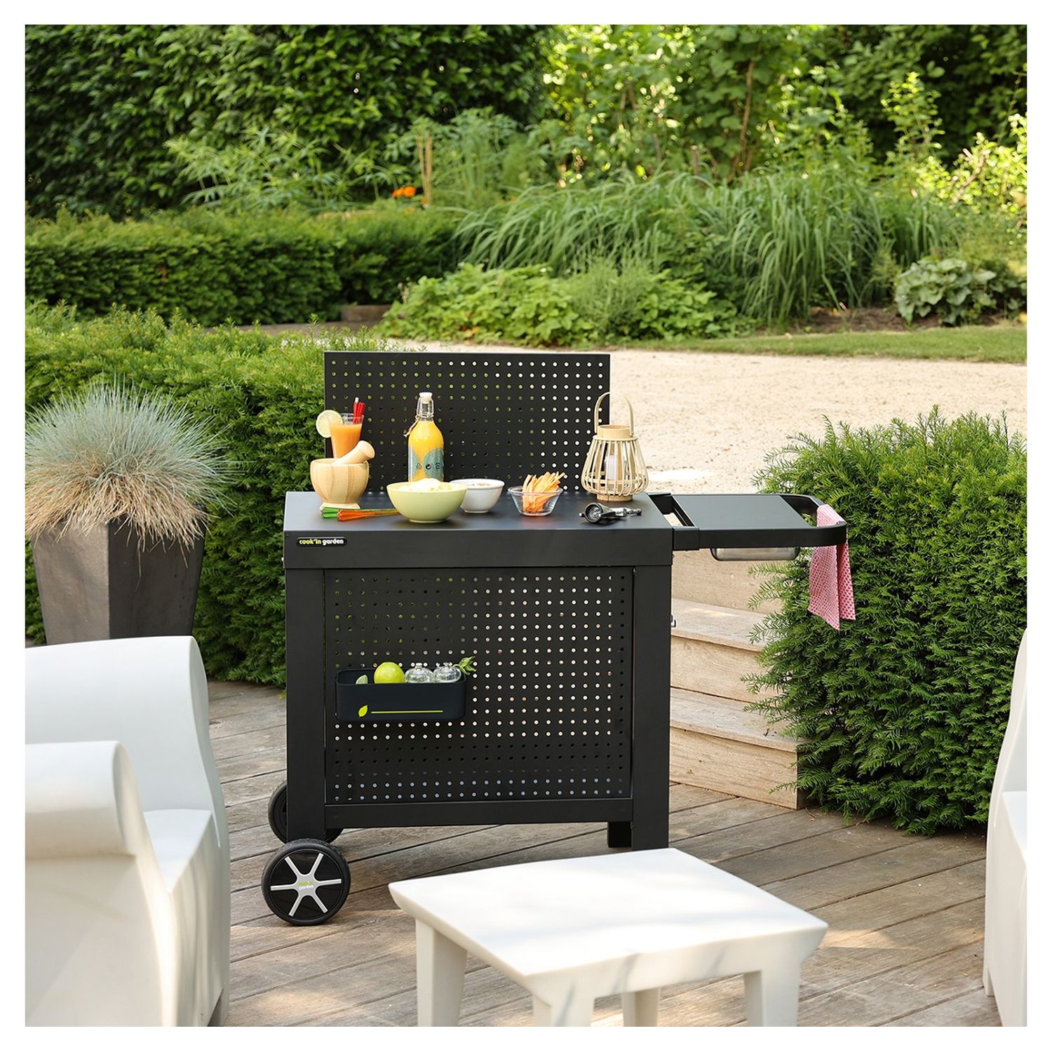 La desserte Reva 110 PREMIUM de chez Cook’in Garden est un meuble d'appoint servant aussi bien de plan de travail ou de rangement ou pour entreposer une plancha. La desserte sur la plateforme haute supporte un poids maximal de 50 kg. La tablette basse quant à elle peut supporter jusqu'à 25 kg. Il est possible d’utiliser la plaque ajourée en jupe ou en crédence. Cette desserte est équipée d' 1 bac à épices, 1 planche à découper, 1 bac en Inox, 1 support poubelle. Montée en moins de 10 minutes sans aucun outil grâce à un système de clips, la desserte dispose de deux roues renforcées ainsi que d’une poignée afin de la déplacer facilement et sans aucun effort. La desserte Reva 110 PREMIUM est garantie 2 ans.