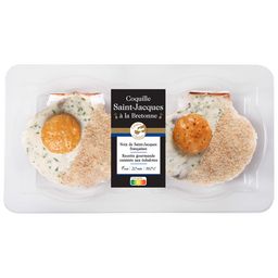Ingrédients : "eau, brisures de NOIX DE SAINT JACQUES 17% (Pecten maximus origine France), CREME légère (CREME, épaississant: carraghénanes), champignons de Paris 7%, farine de BLE, BEURRE, chapelure (farine de BLE, eau, extrait de MALT (ORGE), sel, levure, colorant : bêtacarotène), oignons 3%, échalotes 3%, pain de mie (farine de BLE, eau, levure, sel, huile de colza), vin blanc 2% (conservateur : SULFITES), arôme naturel, fumet de POISSON (POISSON, eau, oignons, poireaux, champignon de Paris, jus de cuisson de MOULE, BEURRE, plantes aromatiques), sel, ail, persil, arôme naturel de poivre, dorure (OEUF, sucre, sel).