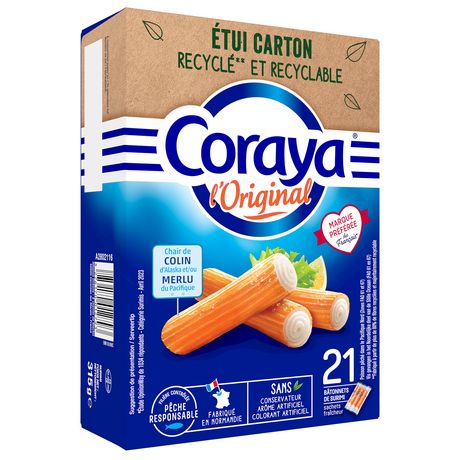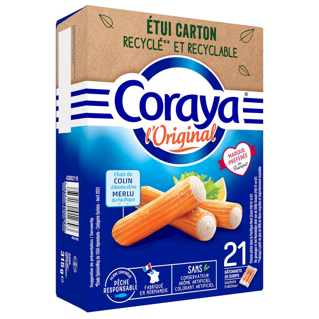 Notre surimi L'Original dans un étui en carton labellisé FSC et fabriqué à partir de 95% de fibres recyclées. Recyclable, nous réduisons ainsi de 19 tonnes la quantité de plastique utilisée par an (réduction de plastique cumulée sur les produits de la gamme L'Original en étui carton et calculée par rapport à 2020)