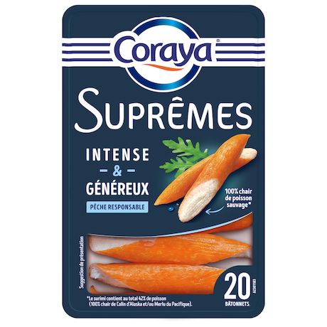Un bâtonnet de surimi au goût intense et à la texture généreuse... Un délice ! Chez Coraya, il y a 1000 façons d'aimer la mer : notre surimi est fabriqué sur les bords de la Manche, à Carentan-Les-Marais, en Normandie ; nous n'utilisons que la chair de poisson, et uniquement la chair ; notre surimi est sans conservateur, sans arôme artificiel, sans colorant artificiel ; le poisson est pêché de manière responsable.
