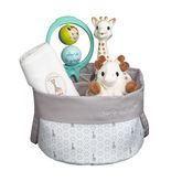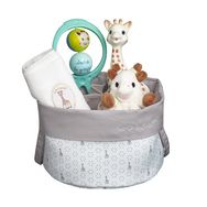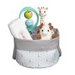 La corbeille de naissance Sophie la girafe de Vulli est une idée de cadeau tendre et originale pour souhaiter la bienvenue à bébé ! Cette jolie corbeille en tissu pour ranger les petites affaires de bébé contient : - La véritable girafe Sophie en caoutchouc - Un doudou Sophie en velours avec atta